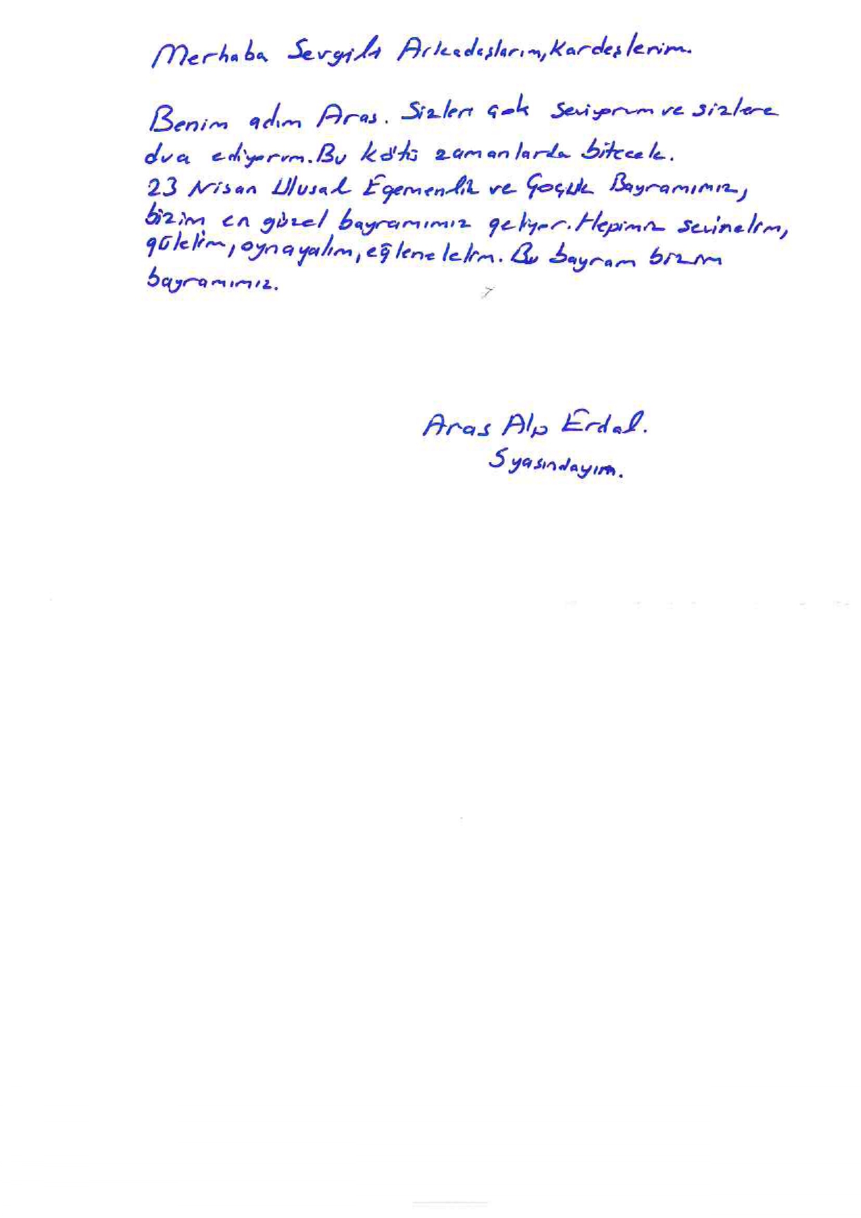TurkishBanklı çocuklarımız, yaşanan acıları bir parça da olsa unutturabilmek amacıyla 23 Nisan Ulusal Egemenlik ve Çocuk Bayramı’nda deprem bölgesindeki arkadaşlarına mektup göndererek bayramlarını kutladı.