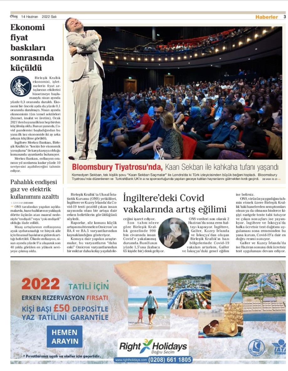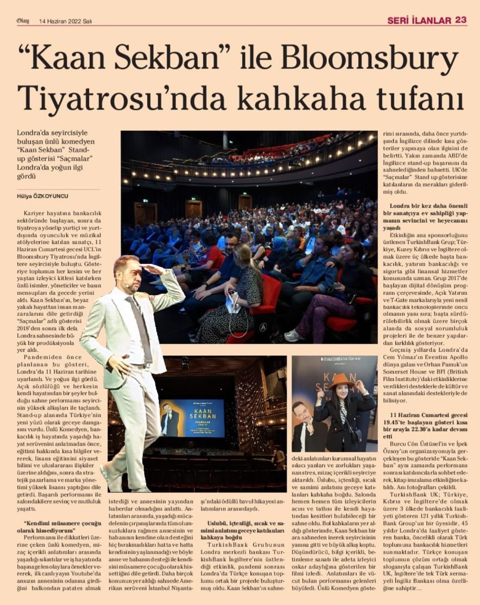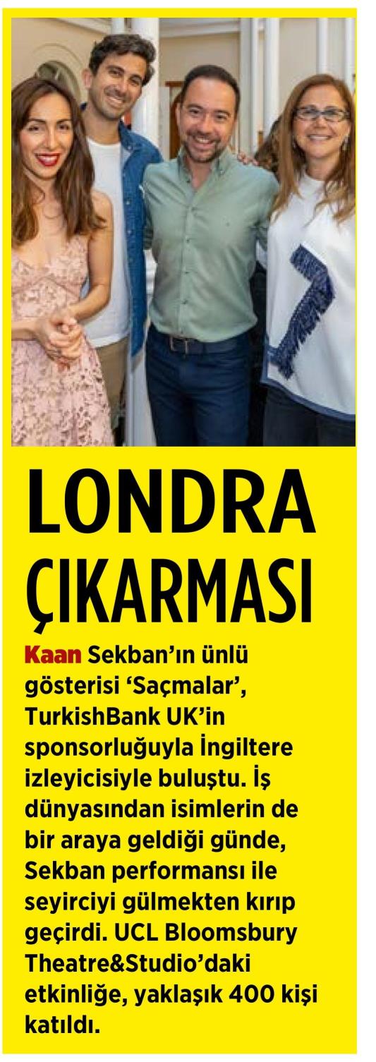TurkishBank UK, pandemi sonrası Kaan Sekban’ın “Saçmalar” gösterisine ev sahipliği yaparak ünlü sanatçıyı tekrar Londra’da Türkçe konuşan toplum ile buluşturacak. Kaan Sekban daha önce yurtdışında İngilizce dilinde kısa gösteriler yapmaya olan ilgisini belirtmiş, yakın zamanda ABD’de İngilizce stand-up’ını başarıyla sahnelemişti. Bu gösteride de İngilizce bir sekme ilave edip etmeyeceği merak konusu oldu.